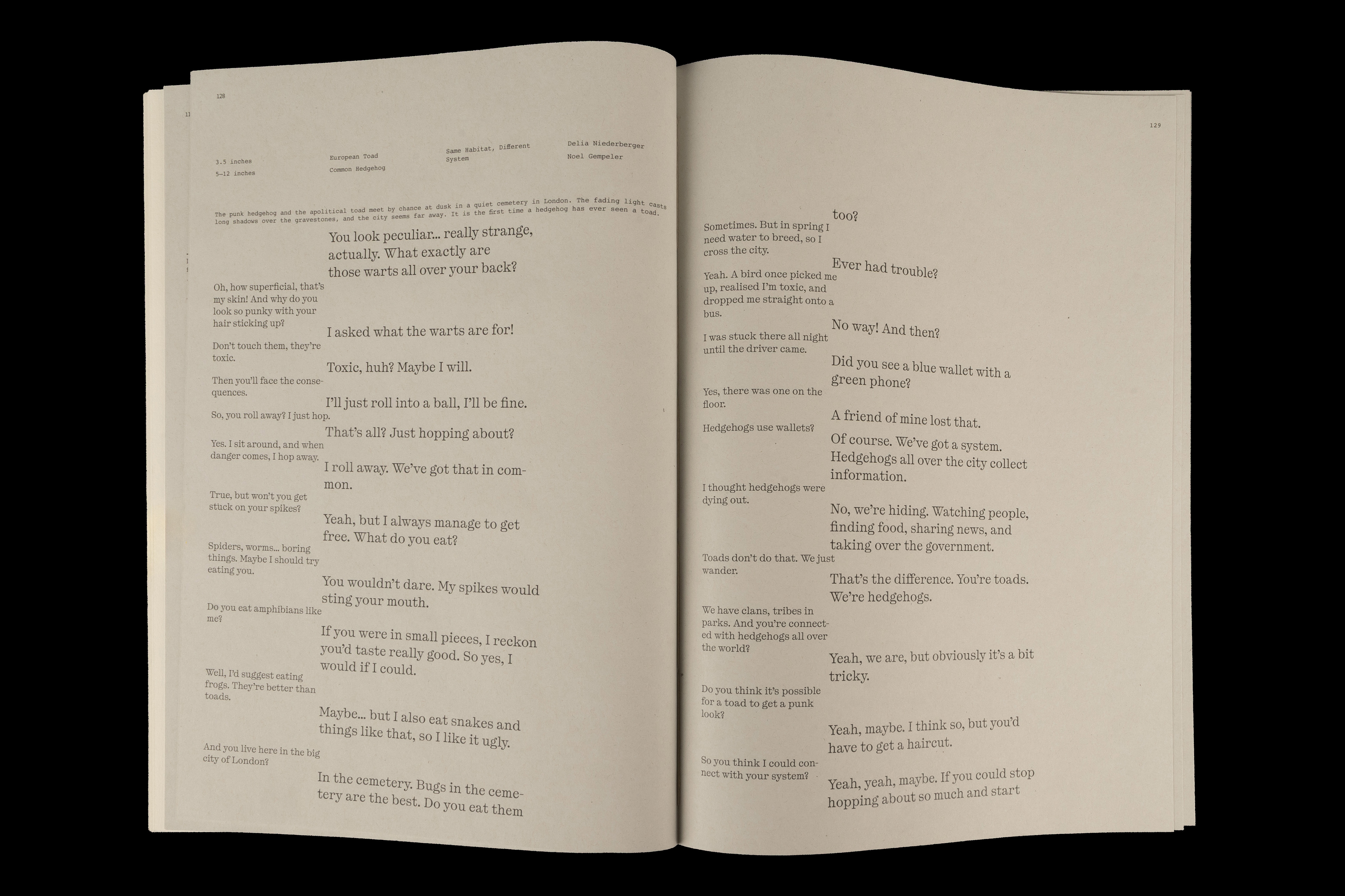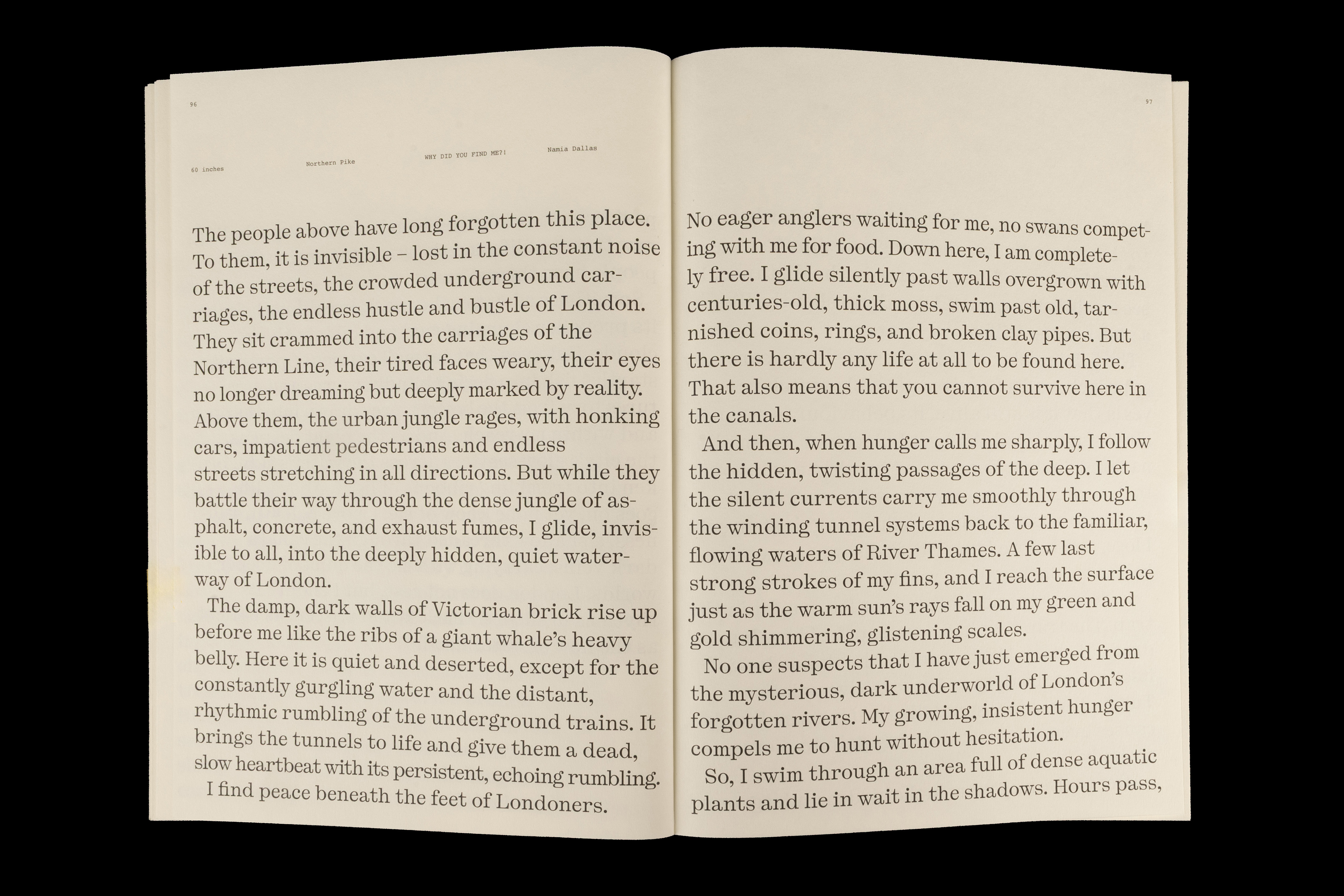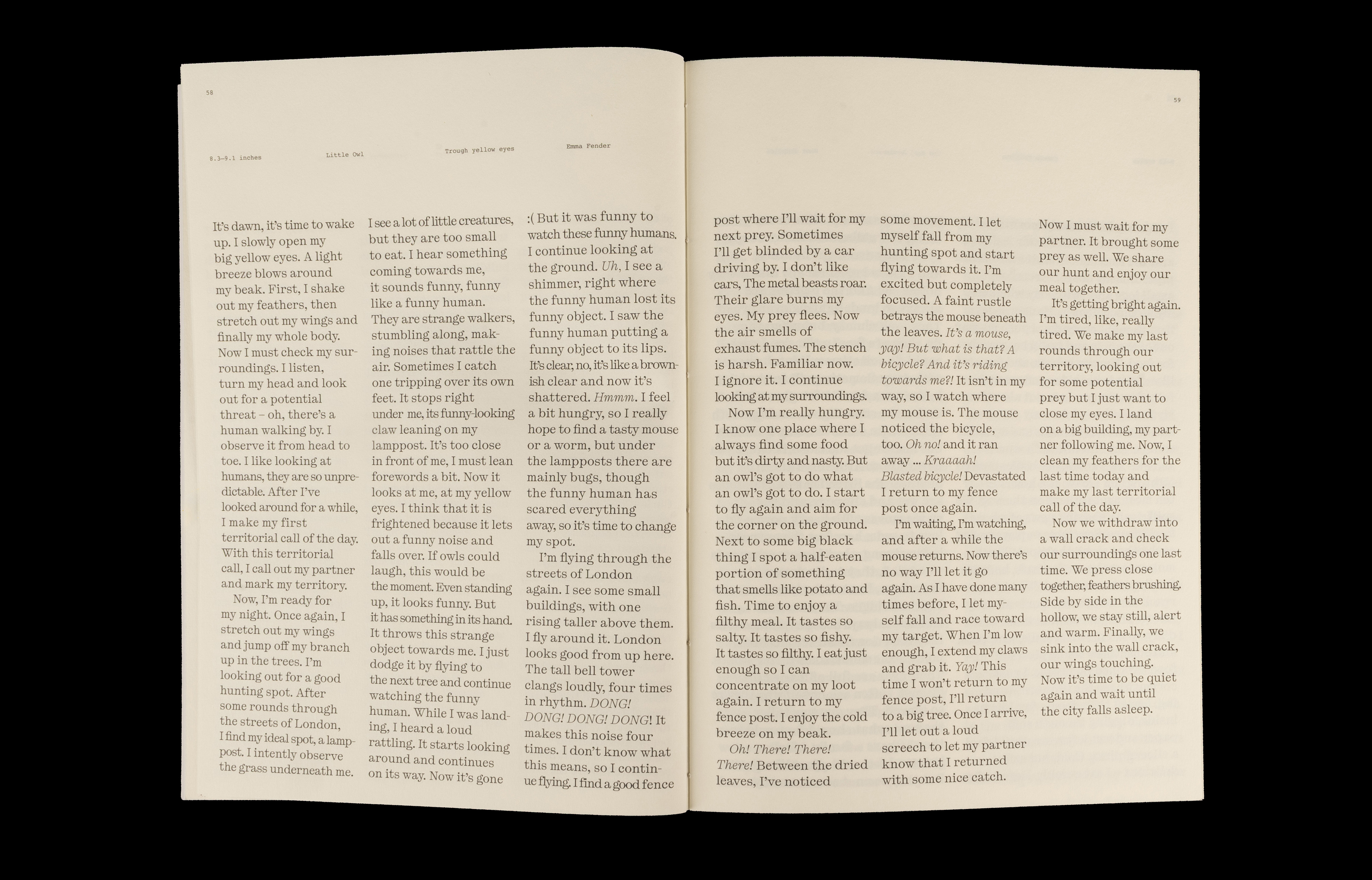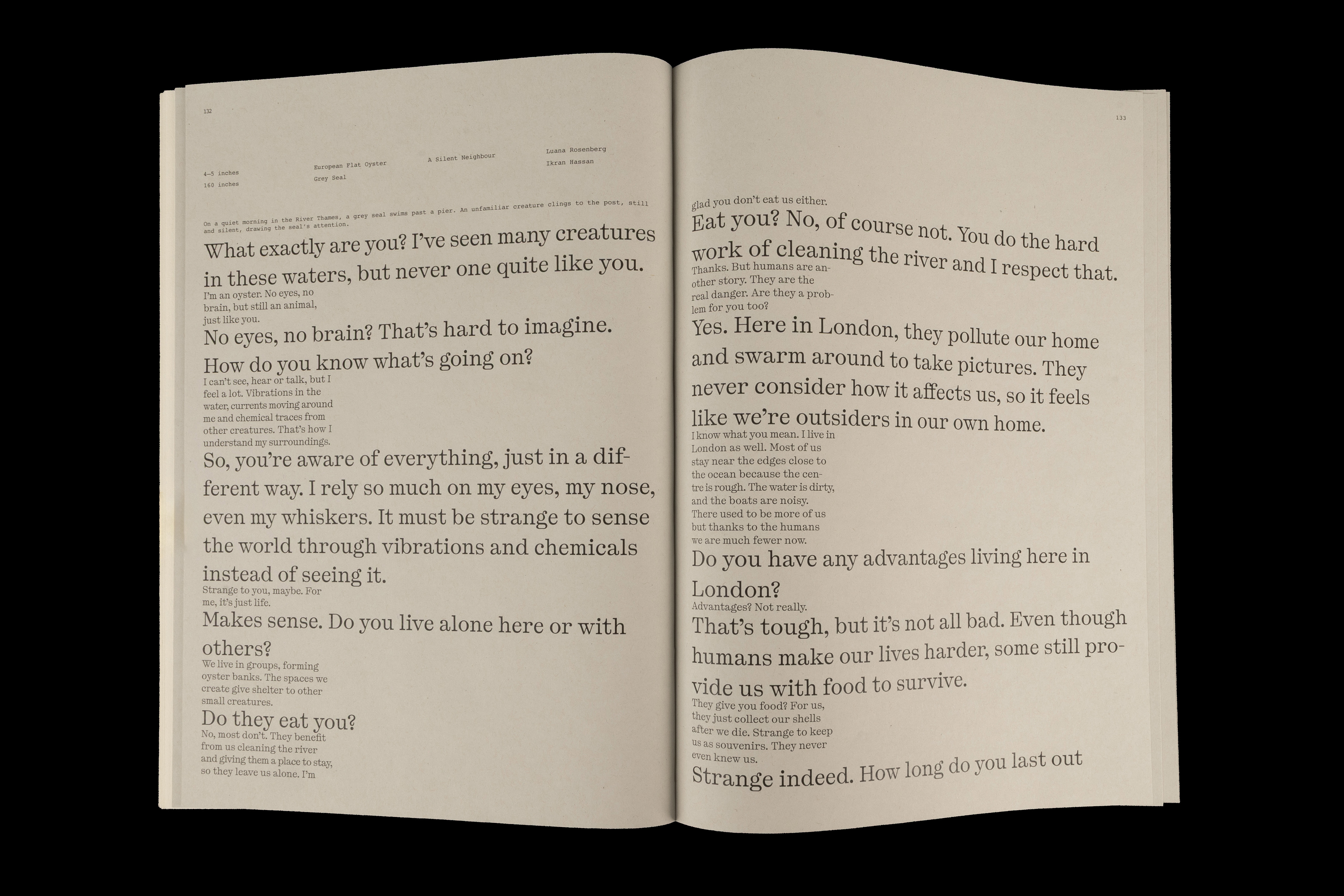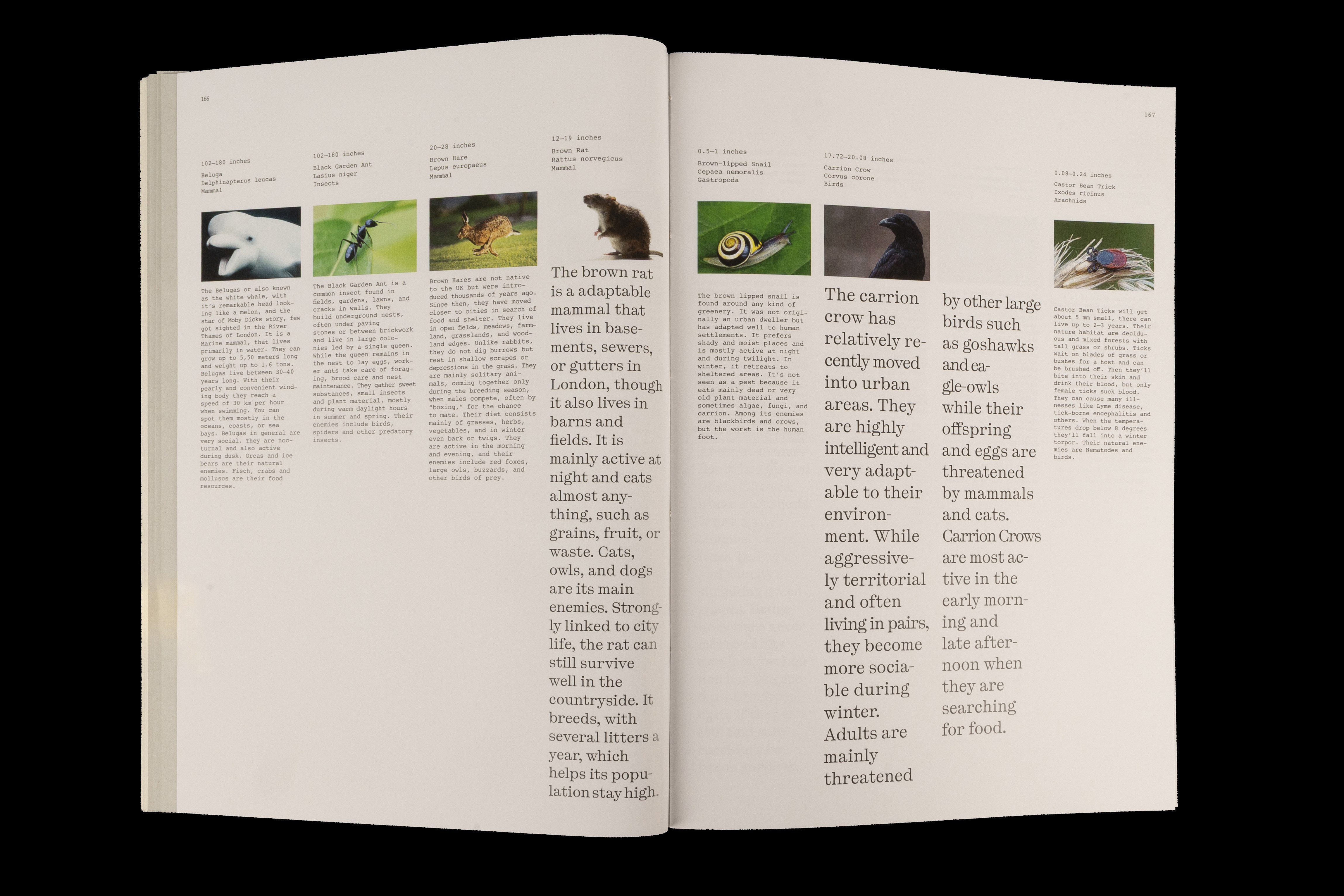 Von menschlichen Fakten zu tierischen Gedanken. Dieses Buch führt weg von nüchternen Informationen hin zu lebendigen Geschichten, Gesprächen und Eigenheiten der Tiere. Seeing London Differently – eine andere Perspektive, entstanden aus vielen Blickwinkeln. Die Tiere sind nach ihrer Grösse geordnet, sodass das Buch vom menschlichen Blick auf die Tiere immer mehr hin zum Blick der Tiere selbst führt. Fotografien und Texte, die in London entstanden sind, präsentieren 22 verschiedene Tiere, vereint in einem Buch. Auch das Material folgt dieser Bewegung. Die Seiten wandeln sich von industriellem hin zu natürlicherem Papier und vertiefen so die Annäherung an das Tier. Drei unterschiedliche Papiere begleiten diesen Übergang und führen die Betrachtenden behutsam weiter in die Sichtweise der Tiere.